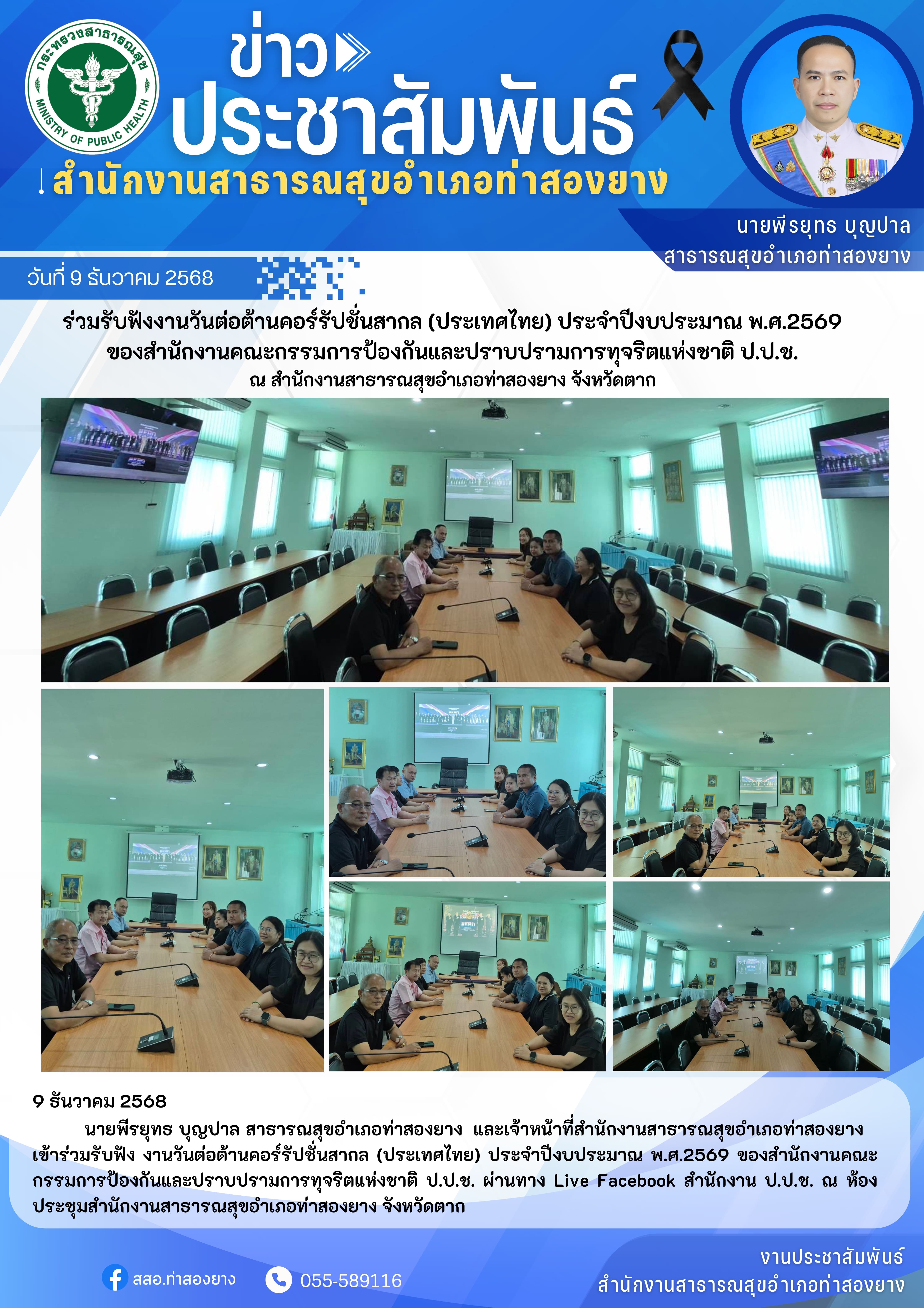 เจ้าหน้าที่สำนักงานสาธารณสุขอำเภอท่าสองยางเข้าร่วมรับฟังผ่านระบบออนไลน์ในกิจกรรม “วันต่อต้านคอรัปชั่นสากล (ประเทศไทย)” วันที่ 9 ธันวาคม 2568 ประจำปีงบประมาณ พ.ศ.2569 ของสำนักงาน ป.ป.ช. ณ ห้องประชุมสำนักงานสาธารณสุขอำเภอท่าสองยาง จังหวัดตาก
